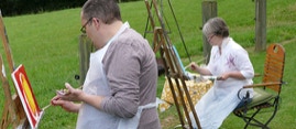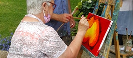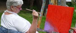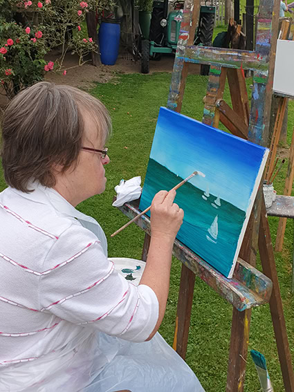 Betreut und begleitet werden die Menschen mit Behinderung in ihrer Freizeit u.a. von Hildegard Langen und Doris Schlimbach. Sie sind seit mehr als 30 Jahren in diesem Ehrenamt tätig. Normalerweise wird von den beiden einmal im Monat ein Freizeit-Event angeboten: Kutschfahrten, Kegeln, Basteln, eine Nikolausfeier oder eine Wochenend-Fahrt sind darunter. Dieses Jahr waren die Aktivitäten bedingt durch Corona auf einen Grill-Nachmittag beschränkt. Das war ein Grund für die STIFTUNG MUCH helfend tätig zu werden, und so hat sie es finanziell ermöglicht, dass der August für Henni, David, Elisabeth und die anderen Maler zu einem ihrer schönsten wurde: Sich kreativ auszudrücken in freier Natur, angeleitet von einem behutsam helfenden Maler, das ist ein Erlebnis, das die Teilnehmer, die Betreuerinnen und die Stifter nicht so schnell vergessen werden!