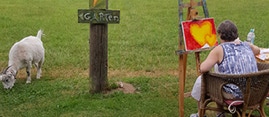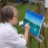 Auch wenn David sich zuerst vor allem für die Ziegen interessierte, die sich da hinter Schlimbach‘s Atelier auf der Wiese tummeln, so entstand bald ein schönes Bild mit einer blauen See und kleinen Segelschiffen am Horizont – Friedhelm Schlimbach half versteckt ein bisschen bei den Schiffen. Feinstarbeit.